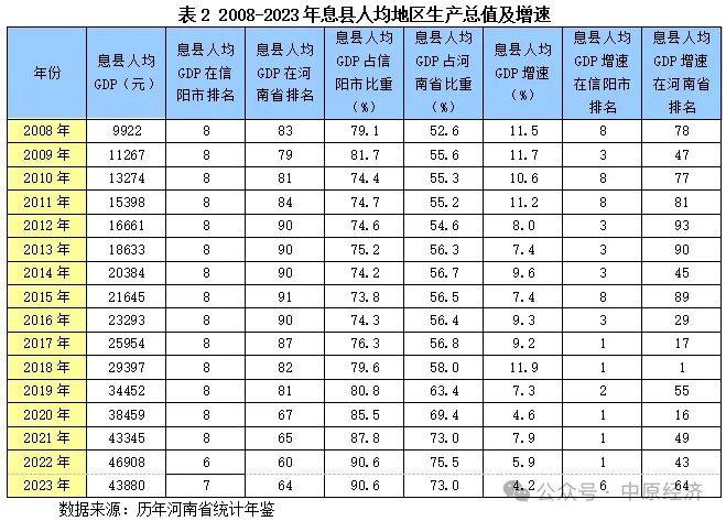 从人均GDP来看,息县人均GDP始终低于河南省平均水平和信阳市平均水平。2023年息县人均GDP为43880元,相当于信阳市人均GDP的90.6%,相当于河南省人均GDP的73.0%,在信阳市下辖8个县(市)中的排名第7位,在河南省下辖102个县(市)中排名第64位。