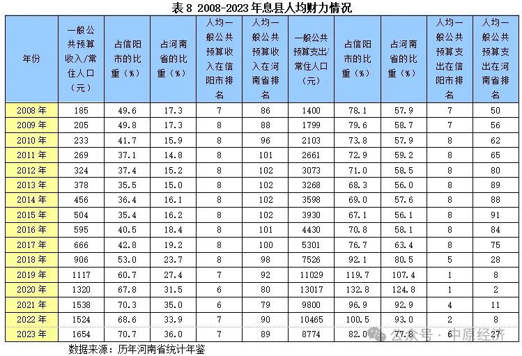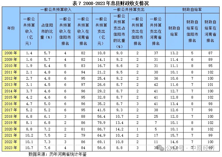 从财政自给率看,2023年为19.0%,在信阳市下辖8个县(市)中排名第7位,在河南省下辖102个县(市)中排第99位。