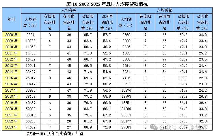 从人均存贷款来看,2023年息县人均存款余额为74609元,相当于信阳市人均存款余额的80.9%,相当于河南省人均存款余额的72.8%,在信阳市下辖8个县(市)中排名第7位,在河南省下辖102个县(市)排名第27位;人均贷款余额为29603元,相当于信阳市人均贷款余额的68.7%,相当于河南省人均贷款余额的35.4%,在信阳市下辖8个县(市)中排名第5位,在河南省下辖102个县(市)排名第71位。