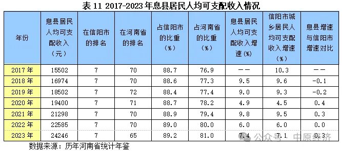 从居民收入看,2023年息县居民人均可支配收入为24246元,相当于信阳市居民人均可支配收入的89.2%,相当于河南省居民人均可支配收入的81.0%,在信阳市下辖8个(市)中排名第7位,在河南省下辖102个县(市)中排名第65位。从居民收入增速看,2023年息县居民人均可支配收入增速为7.4%,高于信阳市居民人均可支配收入增速0.3个百分点。