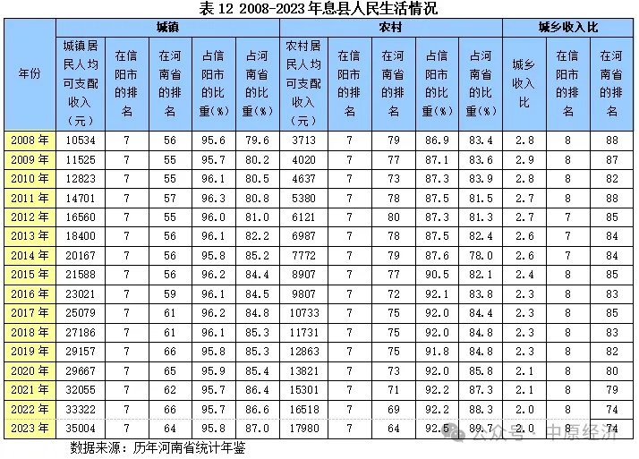 分城乡来看,息县城镇居民人均可支配收入始终低于河南省和信阳市平均水平。2023年息县城镇居民人均可支配收入为35004元,相当于信阳市城镇居民人均可支配收入的95.8%,相当于河南省城镇居民人均可支配收入的87.0%,在信阳市下辖8个县(市)中排名第7位,在河南省下辖102个县(市)中排名第64位;农村居民人均可支配收入为17980元,相当于信阳市城镇居民人均可支配收入的92.5%,相当于河南省城镇居民人均可支配收入的89.7%,在信阳市下辖8个县(市)中排名第7位,在河南省下辖102个县(市)中排名第64位;城乡居民人均可支配收入比约为2.0:1,在信阳市下辖8个县(市)中排名第8位,在河南省下辖102个县(市)中排名第74位,2008年以来城乡收入差距整体上逐步缩小。