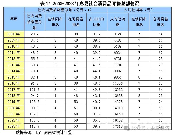 从社会消费情况来看,2023年息县社消零总额为113.7亿元,在信阳市下辖8个县(市)中排名第4位,在河南省下辖102个县(市)中排名第53位;人均社消零为17618元,在信阳市下辖8个县(市)中排名第7位,在河南省下辖102个县(市)中排名第67位。