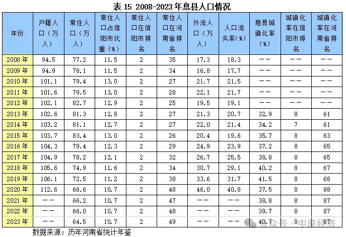 从人口情况看,息县常住人口在全省县域中排名中游,但城镇化率水平较低。人口流失率较高,2020年外流人口46万人,人口流失率达40.8%。2023年息县常住人口为64.5万人,占信阳市常住人口的10.7%,在信阳市下辖8个县(市)中排名第2位,在河南省下辖102个县(市)中排名第49位;城镇化率为40.7%,在信阳市下辖8个县(市)中排名第8位,在河南省下辖102个县(市)中排名第87位。