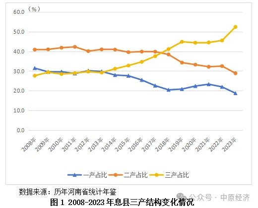 息县是典型的农业县,一产占比较大。2018年,第三产业占比超过第二产业,三次产业结构转变为“三二一”。2023年息县三产结构为18.8:28.9:52.3。