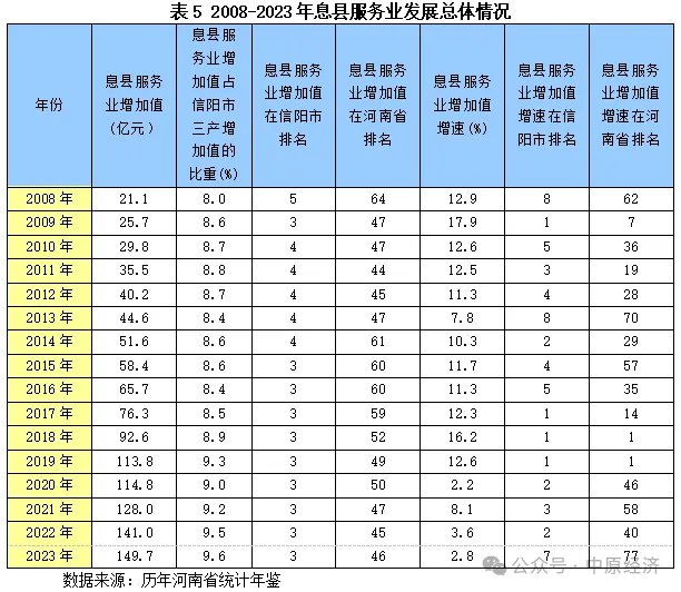 自2008年以来,息县服务业增加值逐年增长。2023年息县服务业增加值为149.7亿元,在信阳市下辖8个县(市)中排名第3位,在河南省下辖102个县(市)中排名第46位。从服务业增加值增速来看,2023年息县服务业增加值增速为2.8%,在信阳市下辖4个县(市)中排名第7位,在河南省102县(市)中排名第77位。