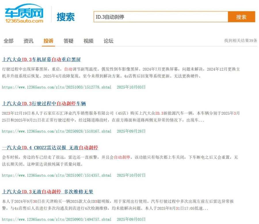 经销商与厂方的检测结果令人咋舌——“系统正常”,无故障记录。这样的答复,对于经历生死一瞬的车主来说,无疑是冷漠与不负责任。车质网数据显示,ID.3自动刹停投诉已超20起,且多发生于隧道或光线复杂路段,传感器误判成为主因。一位车主无奈表示:“购车前最好试一趟隧道,看系统敢不敢信。”这句话,透露出车主对ID.3智能系统的深深不信任。