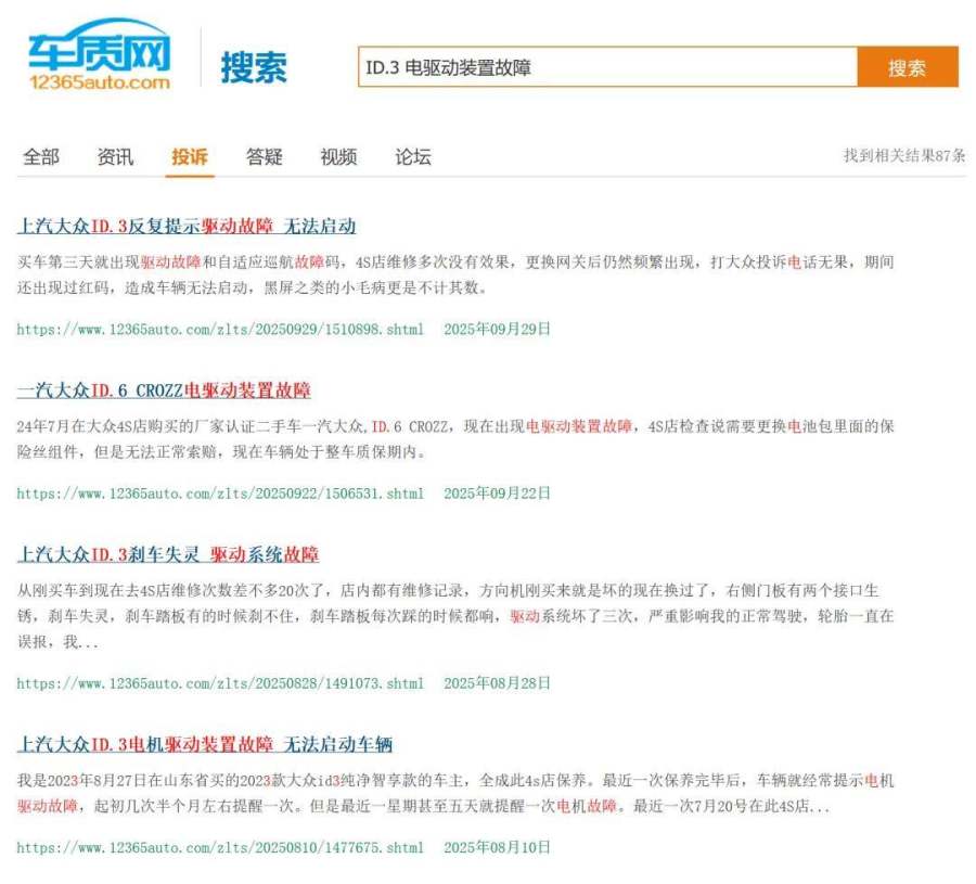 部分搭载磷酸铁锂电池的车型,被车主称为“静置掉电机器”。购车半月即出现夜间停放电量骤降,冬季续航常低于300公里。大众解释为“显示偏差”,建议放电校准BMS,但多数用户称无效。更危险的是失速问题,车质网显示,“电驱动装置故障”投诉数十起,故障灯报警、挂挡失灵、动力中断频发。新车行驶200公里即趴窝者不在少数,一车主半年内四次失速,其中两次在路中央推车脱困,险象环生。