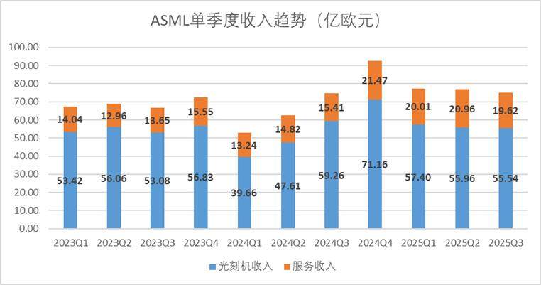 本季度ASML收入结构中,光刻机收入达到了55.54亿欧元,服务类收入达到了19.62亿欧元,分别占总收入的比重为73.9%及26.1%,服务类收入仍处于相对高位。