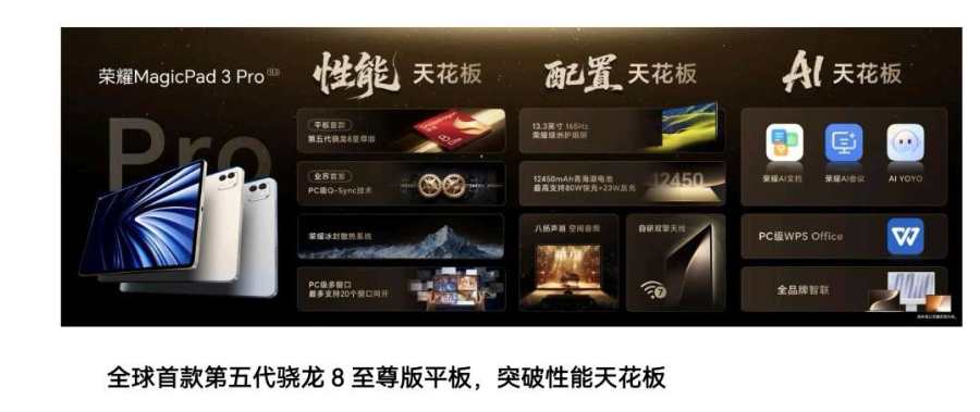 2025年10月15日,“开新局,见未来”荣耀Magic8系列暨MagicOS 10发布会重磅举行,正式发布荣耀MagicPad3 Pro、荣耀手表5 Pro等全场景旗舰新品。荣耀MagicPad3 Pro以全球首发第五代骁龙8至尊版的硬实力,成为最强安卓旗舰平板,即刻开始预定,将于10月23日开启全渠道首销,首销优惠价3799元起。
