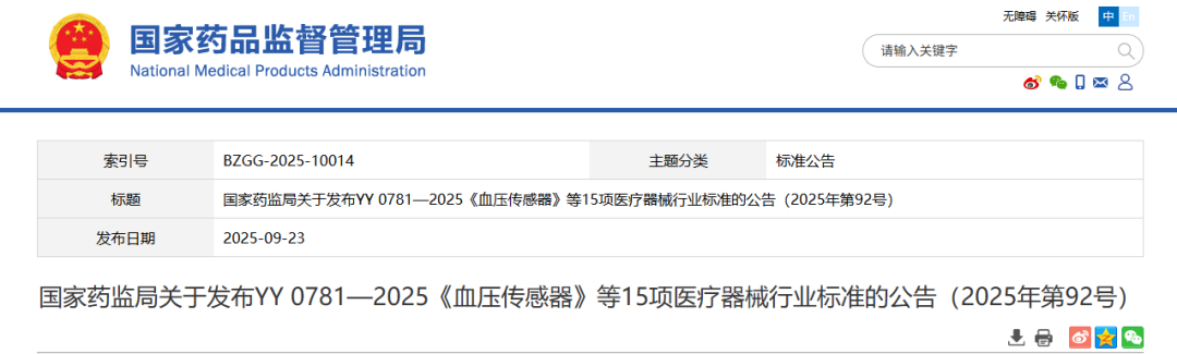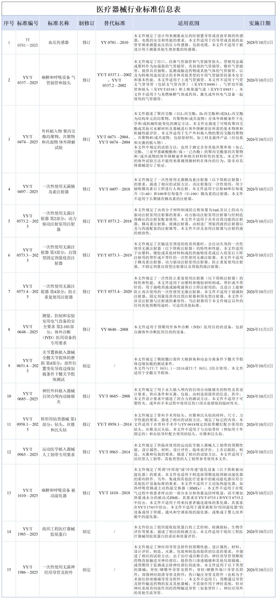 YY 0781—2025《血压传感器》等15项医疗器械行业标准已经审定通过,现予以公布。标准编号、名称、适用范围和实施日期见附件。