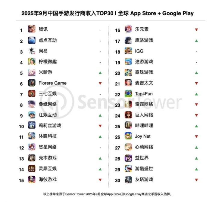 Sensor Tower的数据显示,2025年9月中国手游发行商全球收入总榜,腾讯、点点互动、网易位居排行榜前三,呈现三足鼎立之势。