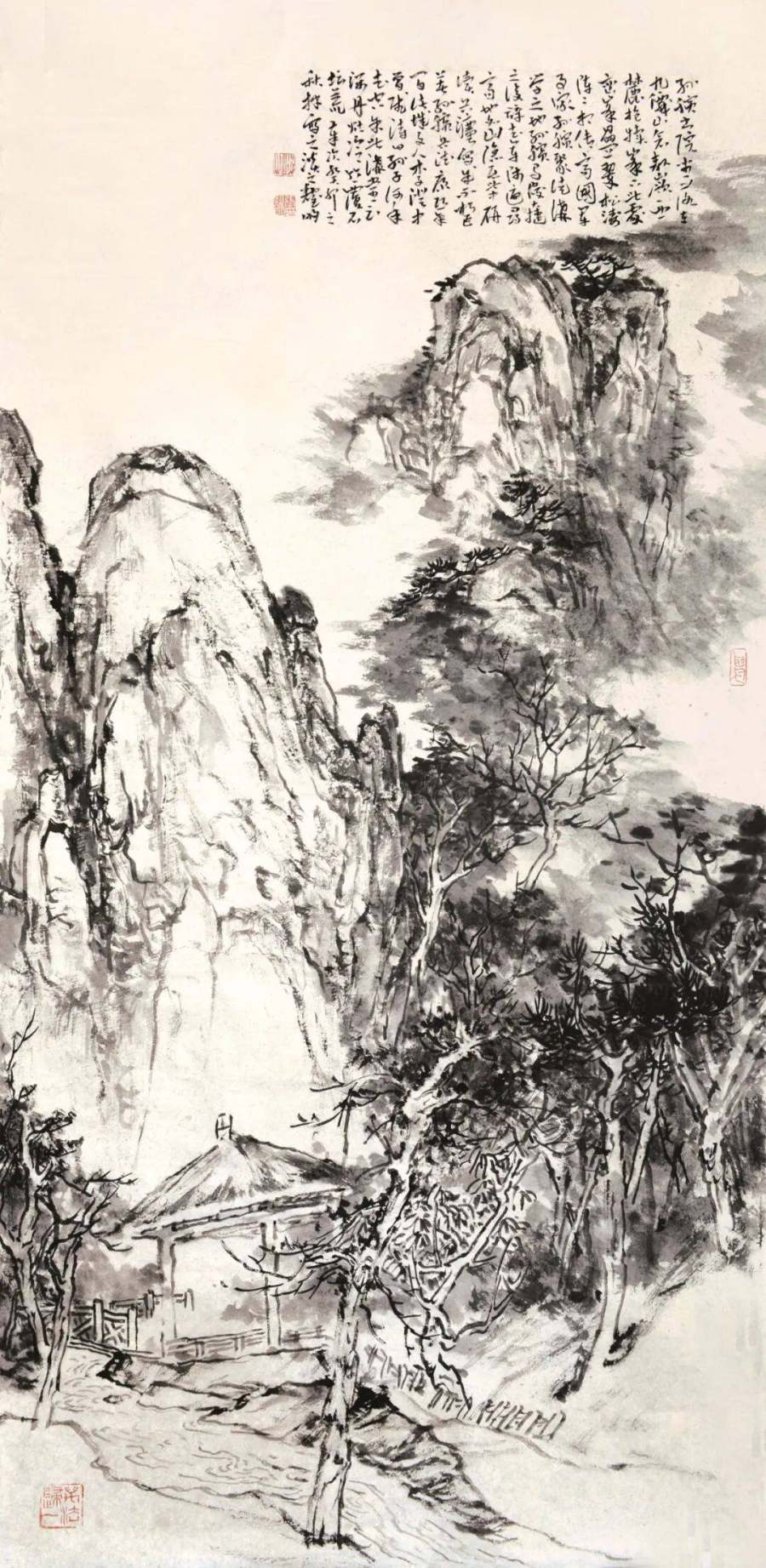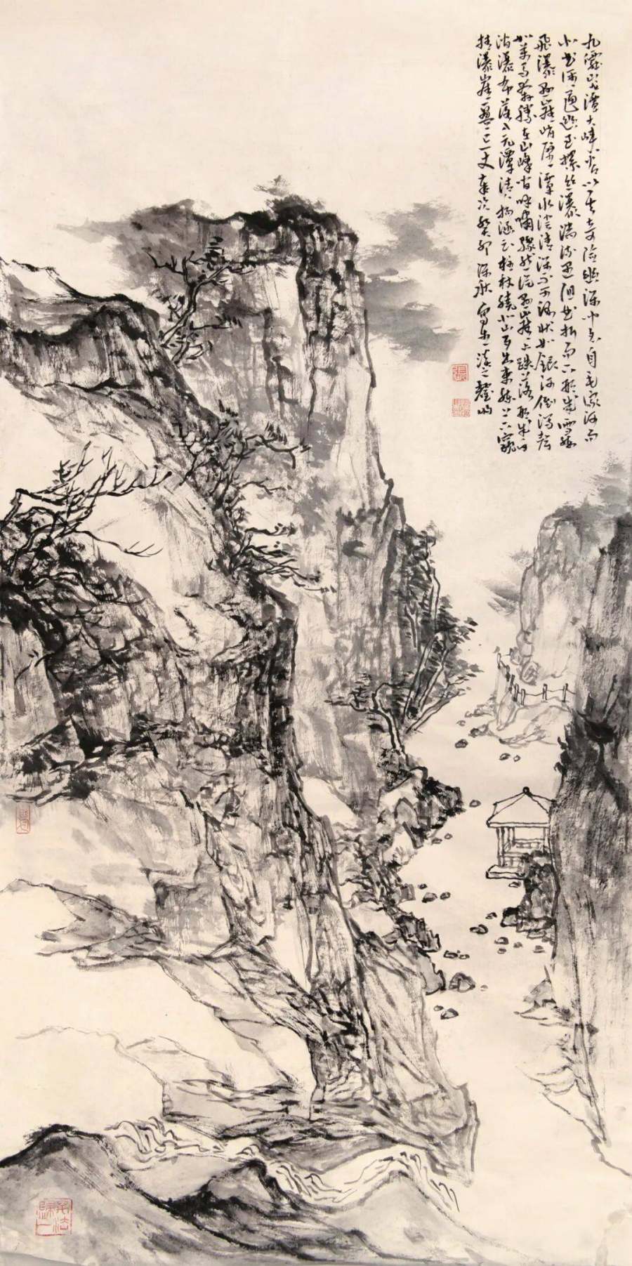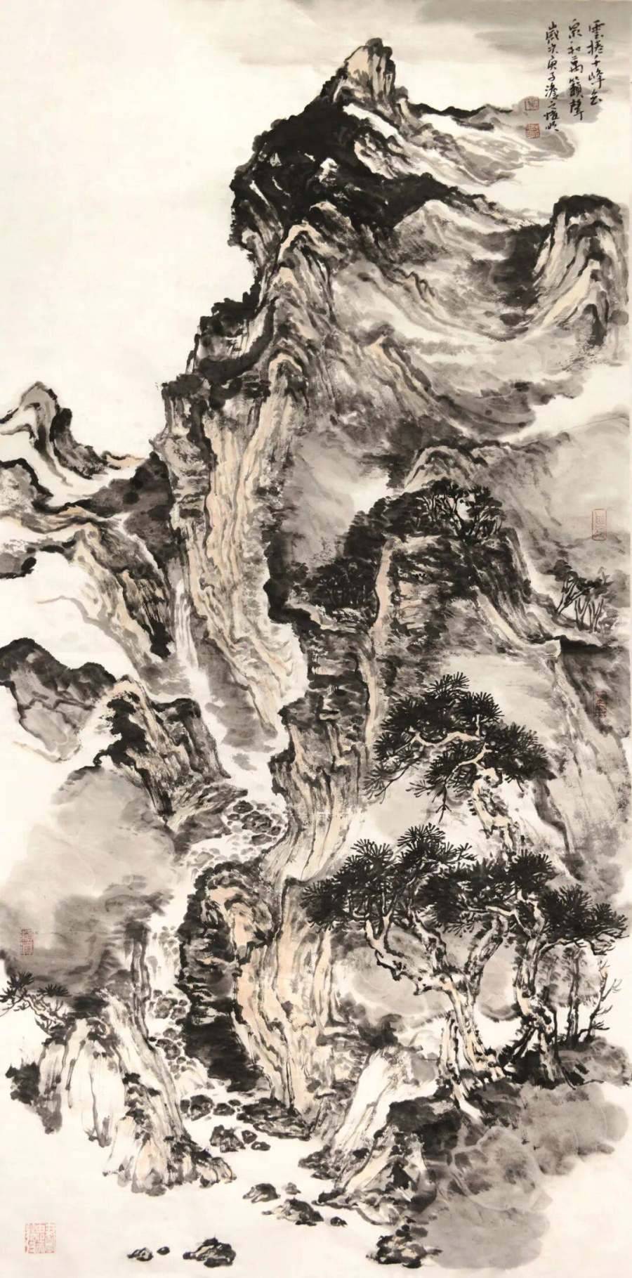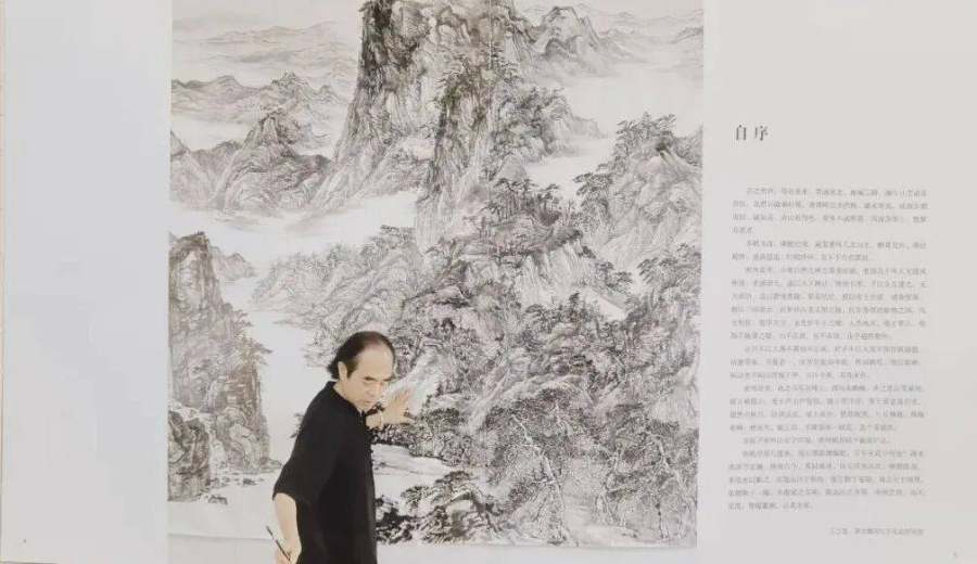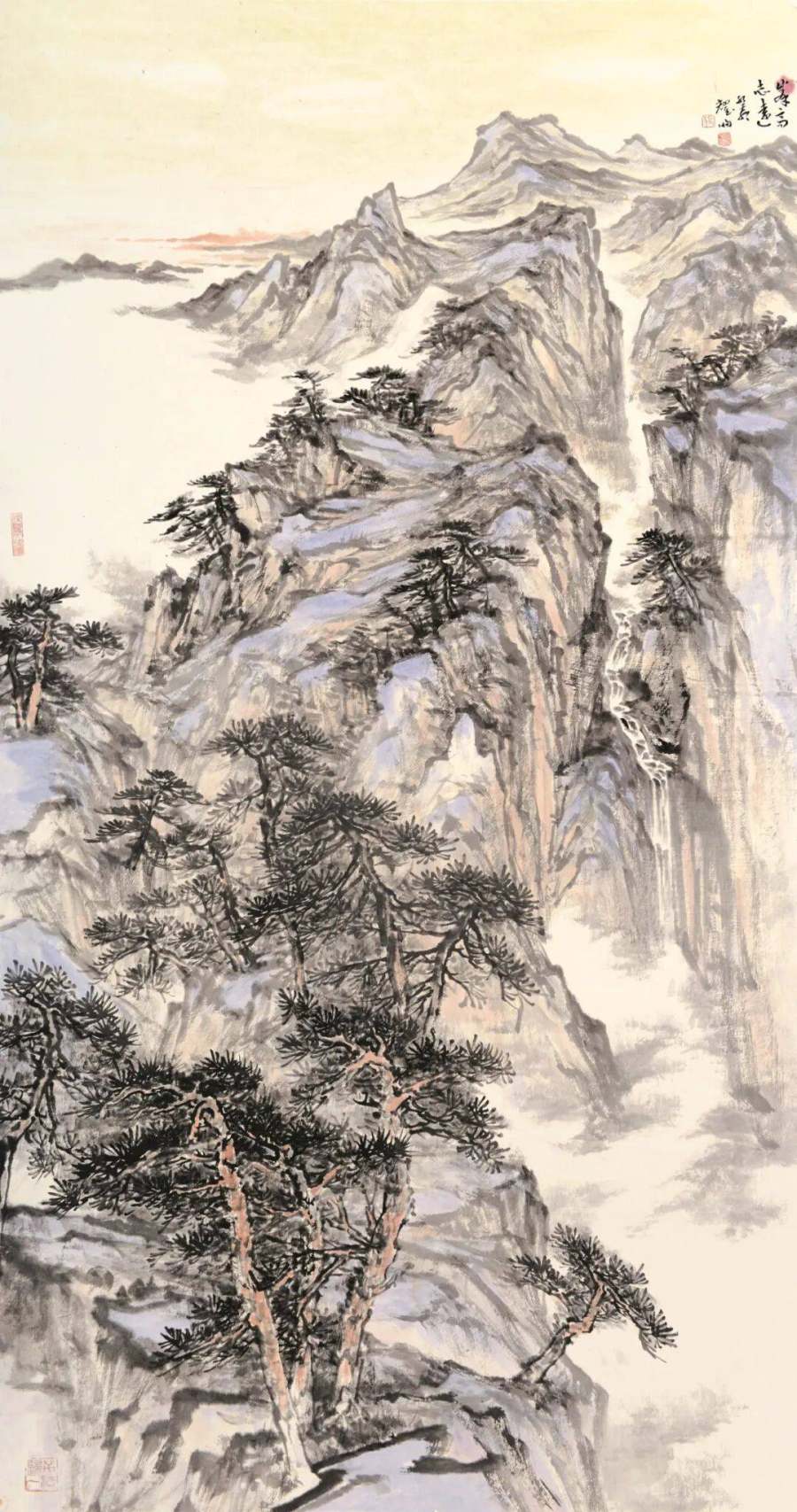 其山水.功力扎实.用笔劲健,布局严严,墨色苍润,既有气势又有意境。有很高的学术深度.艺术广度。真可谓是:古貌新机意韵长.雄秀苍茫气势扬。