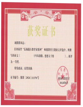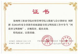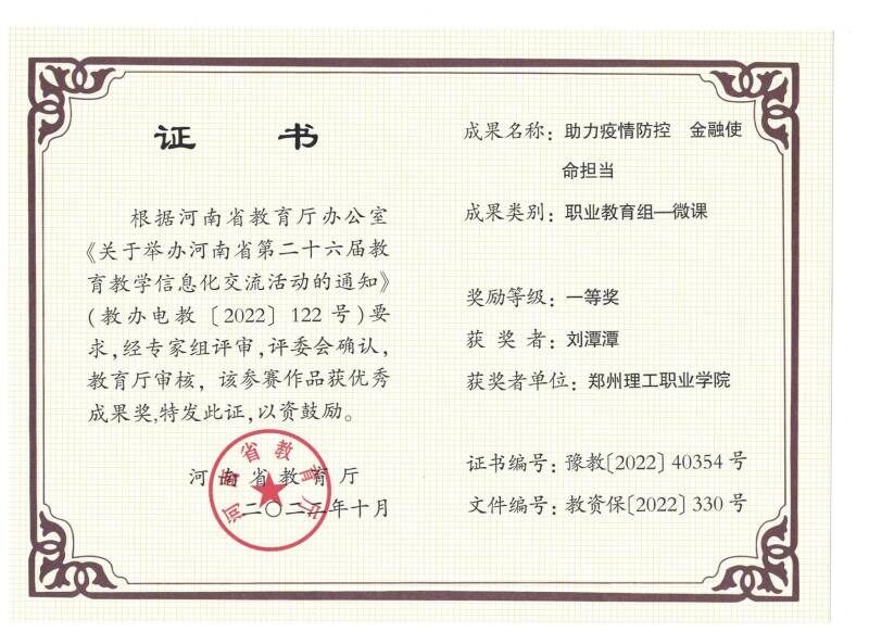 凭借扎实的教学功底、创新的教学方法和突出的科研业绩,先后荣获河南省文明教师、学校“优秀共产党员”“优秀教师”“科研工作先进个人”等荣誉称号,在河南省教育厅举办师德师风征文比赛中获得一等奖两项、二等奖一项,他用行动诠释着“经师”与“人师”的统一。