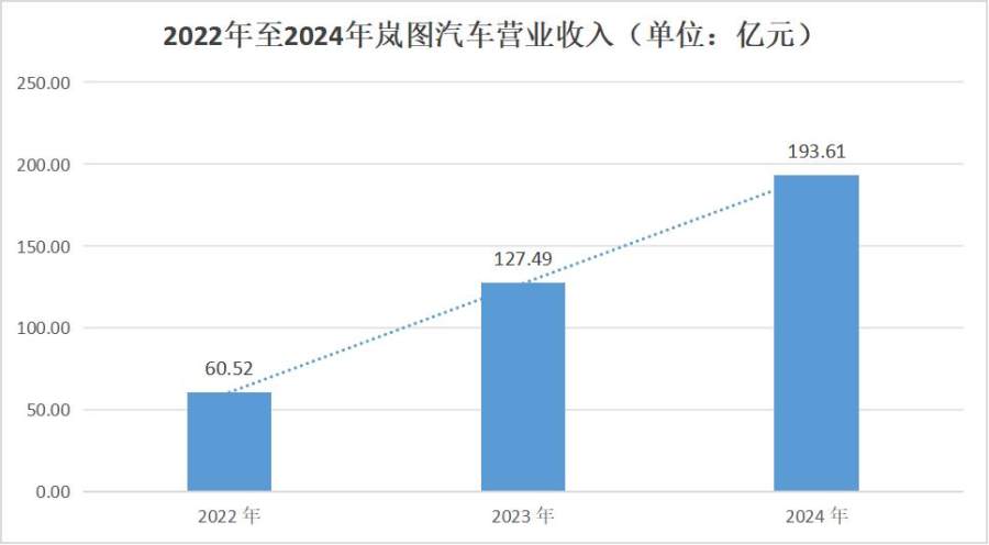 2022年、2023年、2024年,岚图汽车收入分别为60.52亿元、127.49亿元、193.61亿元,期间复合增速达78.9%。