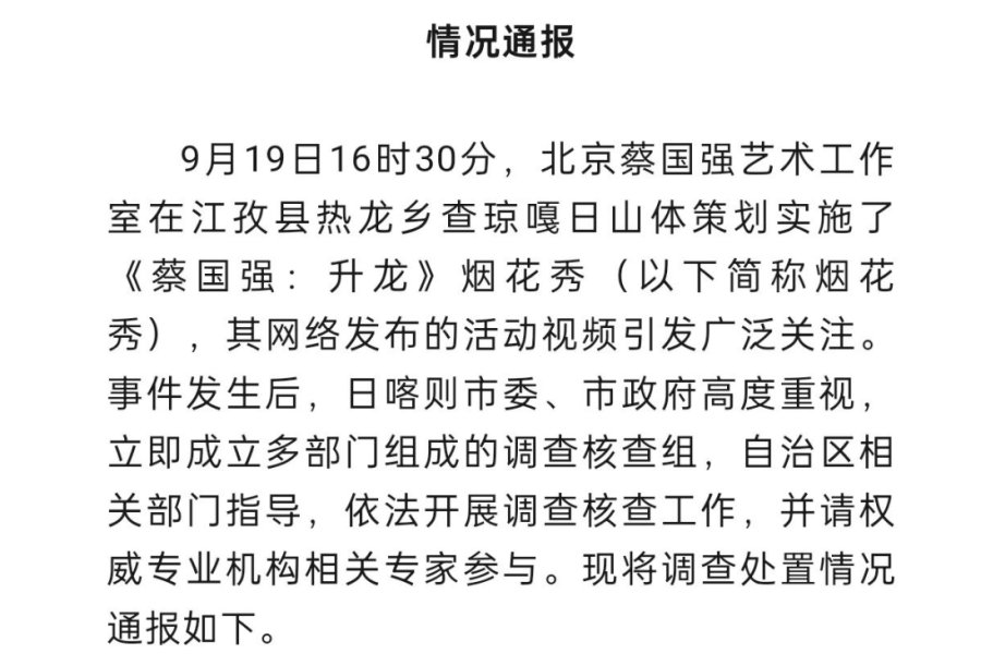 通报显示,9月19日北京蔡国强艺术工作室联合赞助商始祖鸟,在江孜县热龙乡查琼嘎日山体(海拔4670米至5020米生态敏感区)实施《蔡国强:升龙》烟花秀,燃放1050盆烟花时长52秒。