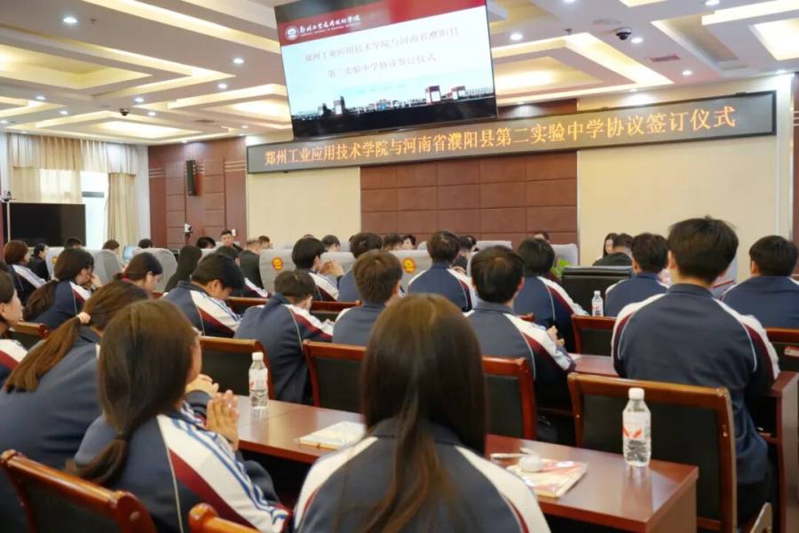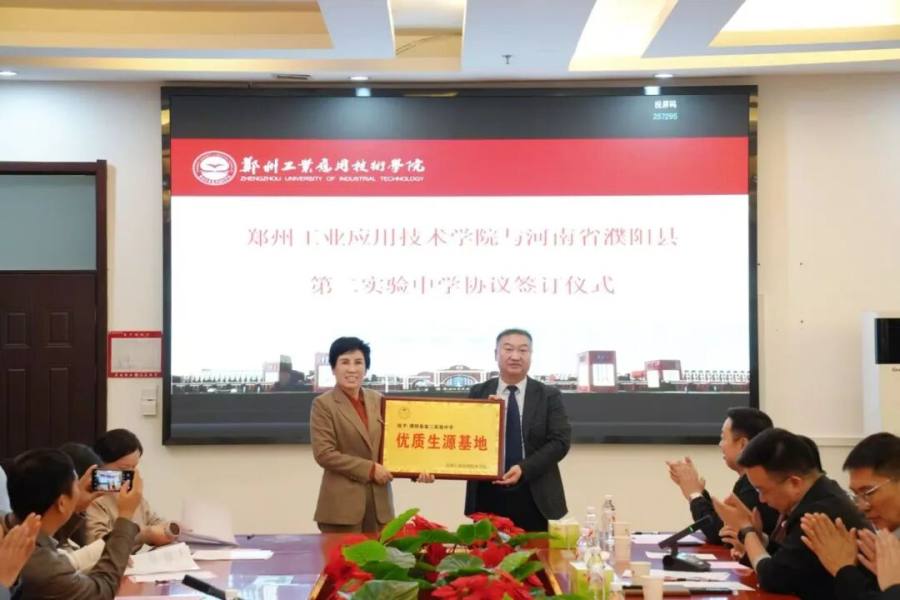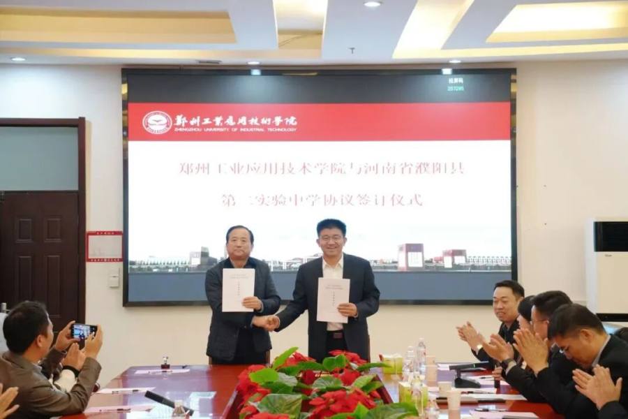 10月16日,郑州工业应用技术学院与河南省濮阳县第二实验中学生源基地协议签订仪式在行政管理中心二楼会议室举行。这不仅象征着郑工开启教育新征程,同时也开启了濮阳县第二实验中学与高校协同育人的新尝试。濮阳县第二实验中学教育集团董事长蔡玉坤,校长张克来、副校长段盈武等班子成员及师生代表;中原华信控股集团总裁、郑州工业应用技术学院理事长谷建光,校长闫兵及在校校领导出席签订仪式。签订仪式由郑州工业应用技术学院副校长贾圣强主持。