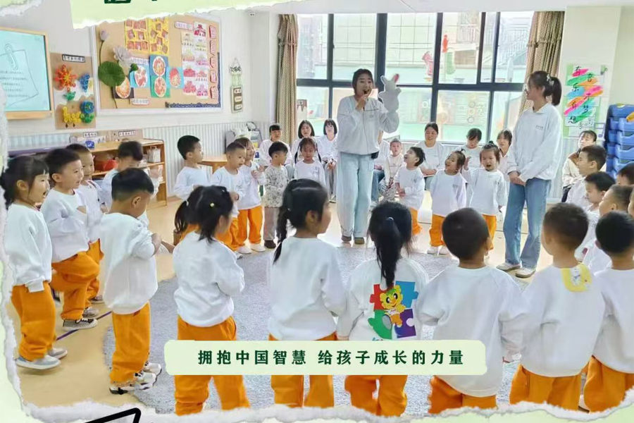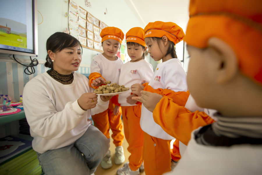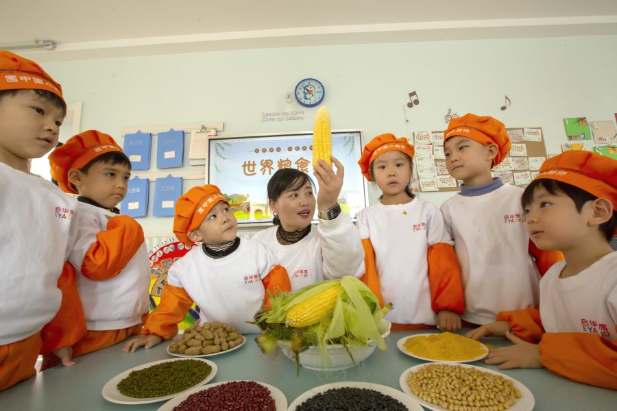 安阳市龙安区太行小区街道华秀社区园中园幼儿园大(4)班,王瑶老师正在给孩子们讲述世界粮食日的来历。