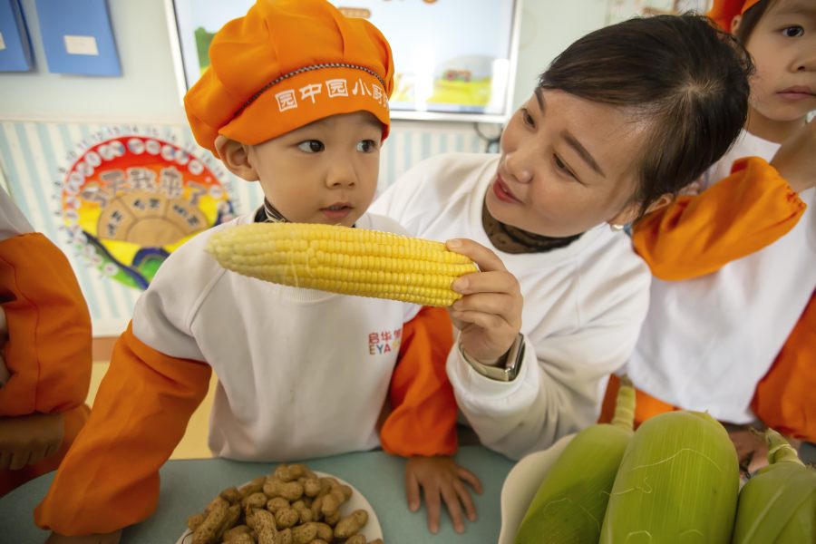 2025年10月15日,河南省安阳市龙安区太行小区街道华秀社区园中园幼儿园,孩子们在认真聆听李红娇老师讲述一个玉米棒和一粒玉米粮的故事。(毕兴世 摄)