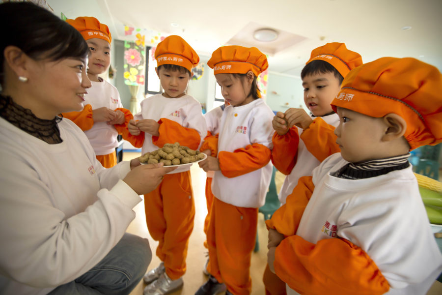 李园长让孩子们用小手轻轻地、小心地、用力把它剥开,露出一对儿“小白人(仁)”花生米。