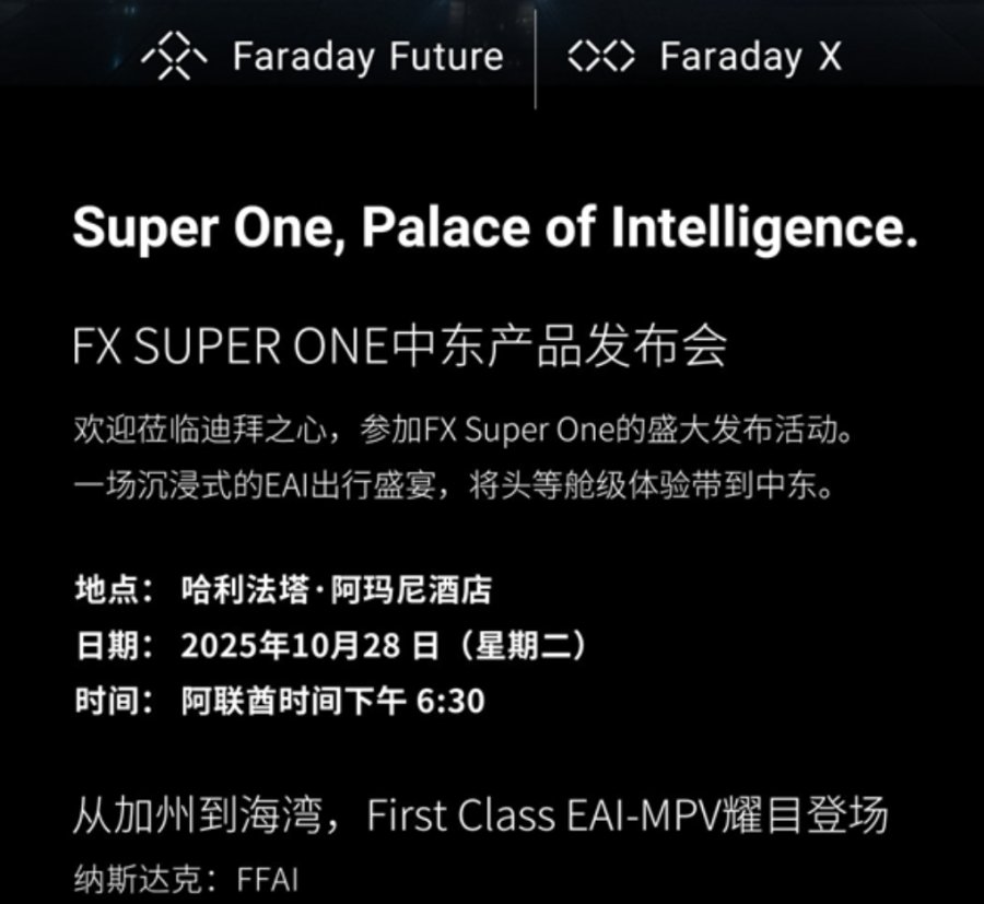 活动将于阿联酋时间10月28日下午6:30启动,核心环节包括FX Super One产品展示与功能解读、FF与FX管理层主题演讲,同时为行业领袖、媒体及合作伙伴提供VIP接待与高端交流机会,全面呈现这款车型融合豪华、AI与智能驾驶的核心优势。