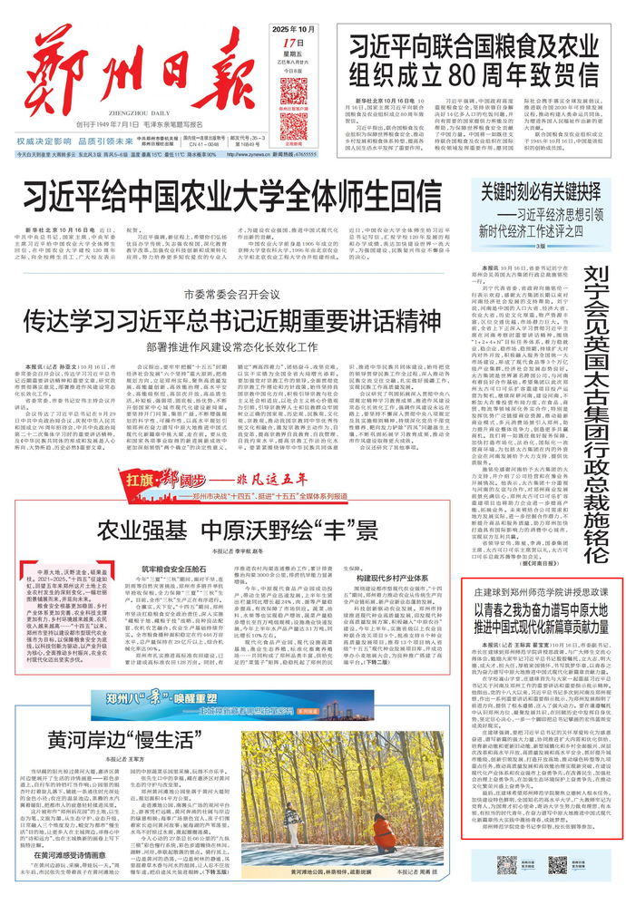 在学校嵩山学堂,庄建球首先与大家一起重温习近平总书记关于河南及郑州工作的重要讲话和重要指示批示精神。他指出,党的十八大以来,习近平总书记多次到河南及郑州视察,作出一系列重要讲话和重要指示批示,为郑州发展指明了前进方向、提供了根本遵循、注入了强大动力。要在谨遵嘱托中认识郑州方位、凝聚发展共识,在回顾历史中发挥自身优势、坚定信心决心,一步一个脚印把总书记擘画的宏伟蓝图变成美好现实。
