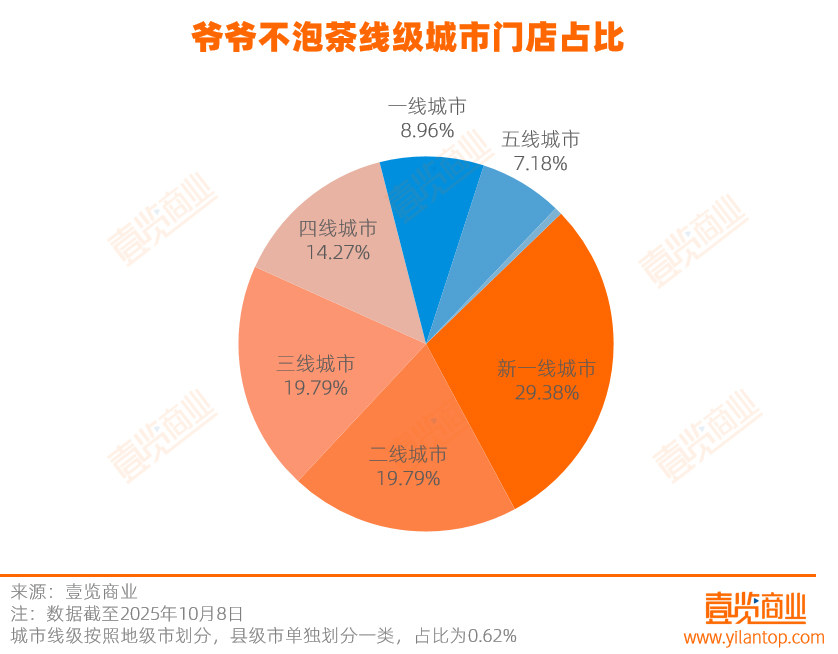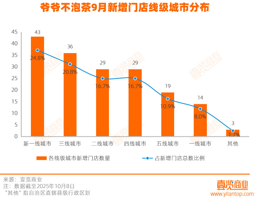 高线城市依然是茶饮品牌展示形象、获取高流量的关键阵地。截至10月8日,爷爷不泡茶在一、二线及新一线城市的门店有1401家,占比58.13%,持续占据其业务版图的半壁江山。与9月的1328家同类型门店相比,一个月内净增73家,门店网络进一步加密。