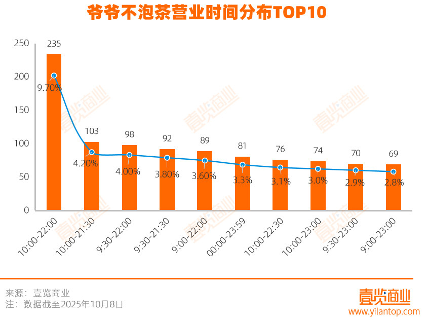 壹览商业数据显示,截至10月8日,在爷爷不泡茶所有门店中,营业时间为10:00—22:00的门店数量最多,共计235家,占总数的9.7%;其次为10:00—21:30的时段,覆盖103家门店,占比4.3%。这两类时段基本覆盖了多数商圈的核心消费时段。