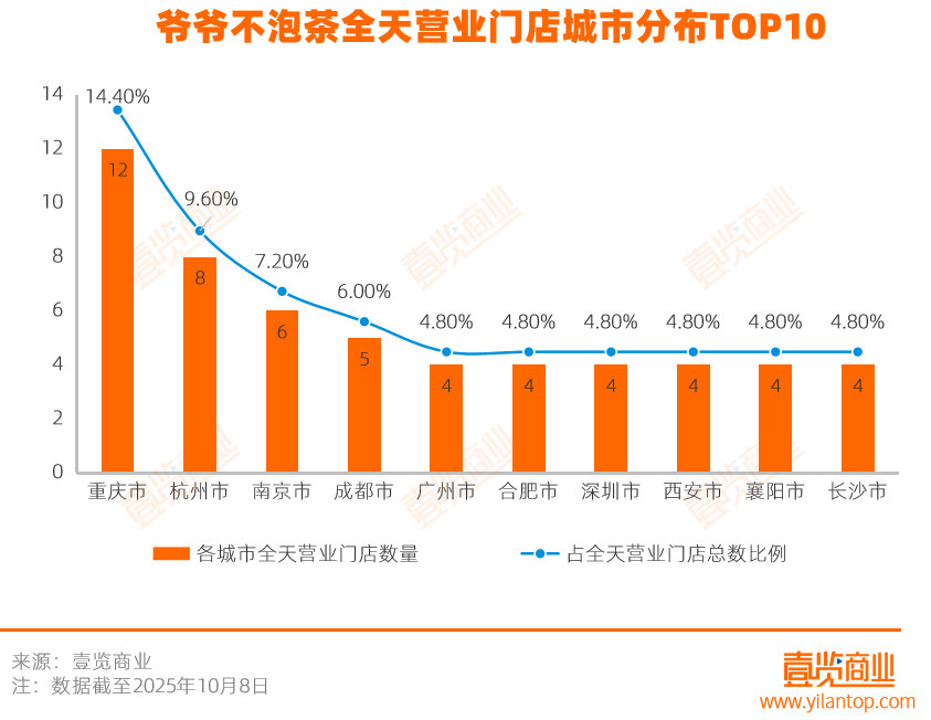 在快速扩张门店数量的同时,爷爷不泡茶也在运营细节上不断调整,形成了与客群作息匹配的营业时间体系,不过外卖业务的区域覆盖仍存在明显不均衡。