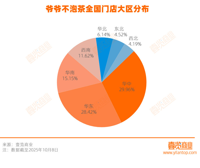 从全国布局看,爷爷不泡茶的业务高度集中于华中、华东和华南三大区域。壹览商业数据显示,爷爷不泡茶在华中布局了722家门店,占全国总门店数的29.96%;华东以685家门店紧随其后,占比28.42%;华南则开设365家门店,占比15.15%。