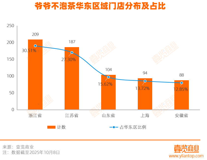 在华东区域,爷爷不泡茶的门店高度集中于长三角核心区。浙江、江苏、上海合计490家门店,占据了华东区域总门店数的71.53%。