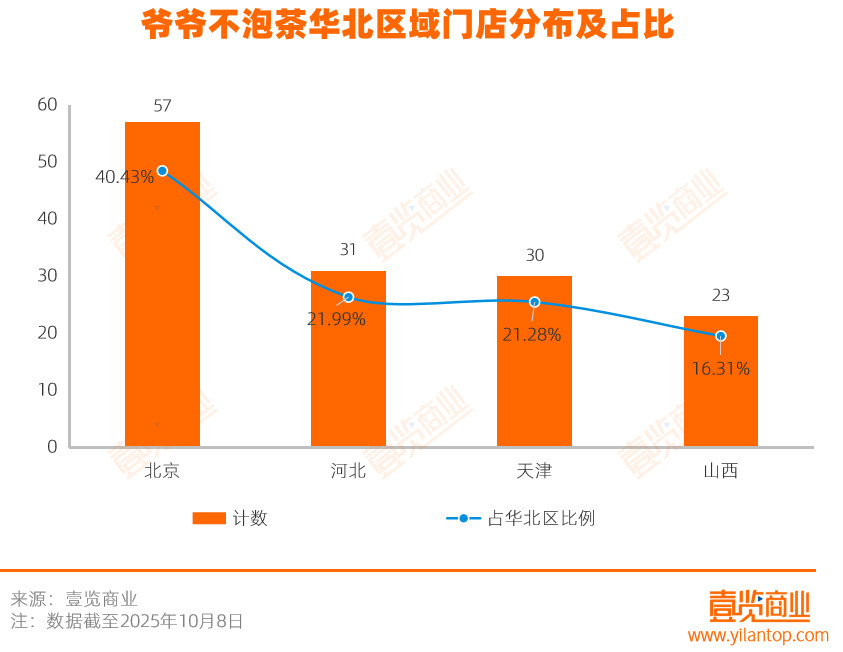 在华北,品牌布局高度聚焦于京津冀城市群。爷爷不泡茶在北京开设了57家门店,占华北区域的40.4%;天津则布局了30家门店,占比21.2%;排在第三的石家庄有10家,占比约7%,合计占华北区域门店总数的65.54%。