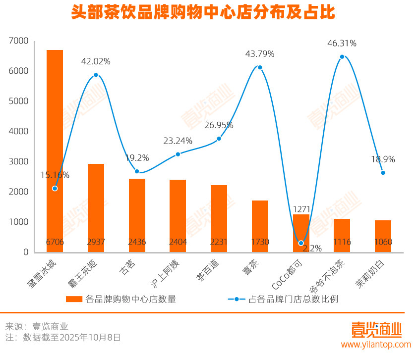 核心城市群的布局需依托高频消费载体,在商业渠道选择上,爷爷不泡茶优先绑定全国性连锁购物中心,以快速实现品牌曝光与客流转化。壹览商业数据显示,爷爷不泡茶有1116家门店位于购物中心,占品牌门店总数的46.31%。