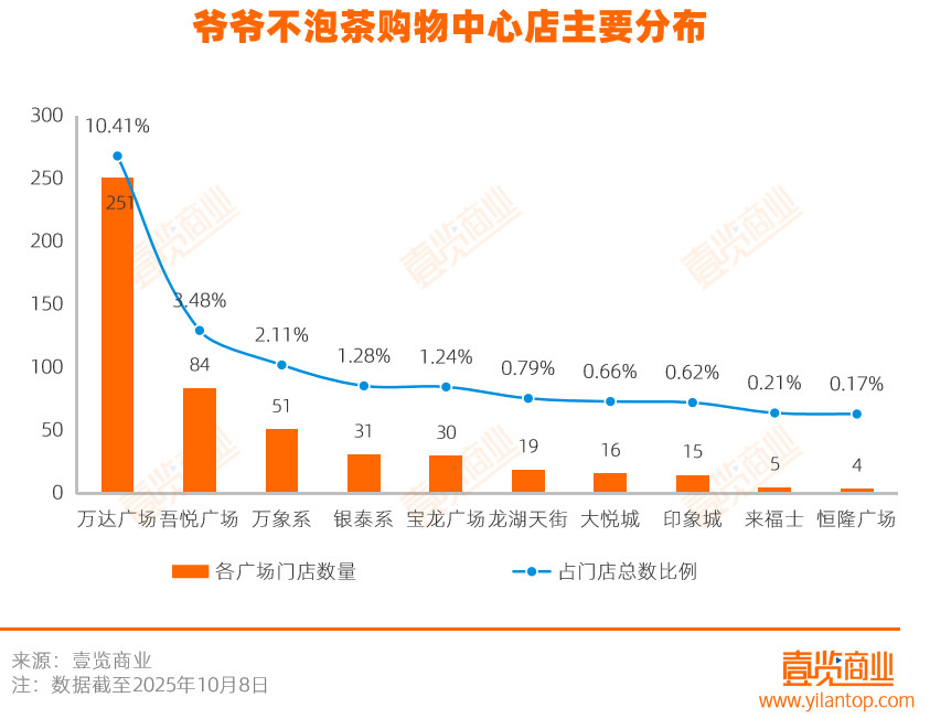 在爷爷不泡茶入驻的购物中心中,万达广场店数量达251家,占该品牌总门店数的10.4%,位居各类商业项目之首。截至2024年底,全国在营万达广场共513座,相当于爷爷不泡茶已覆盖其中约48.9%的项目,渗透率接近半数。
