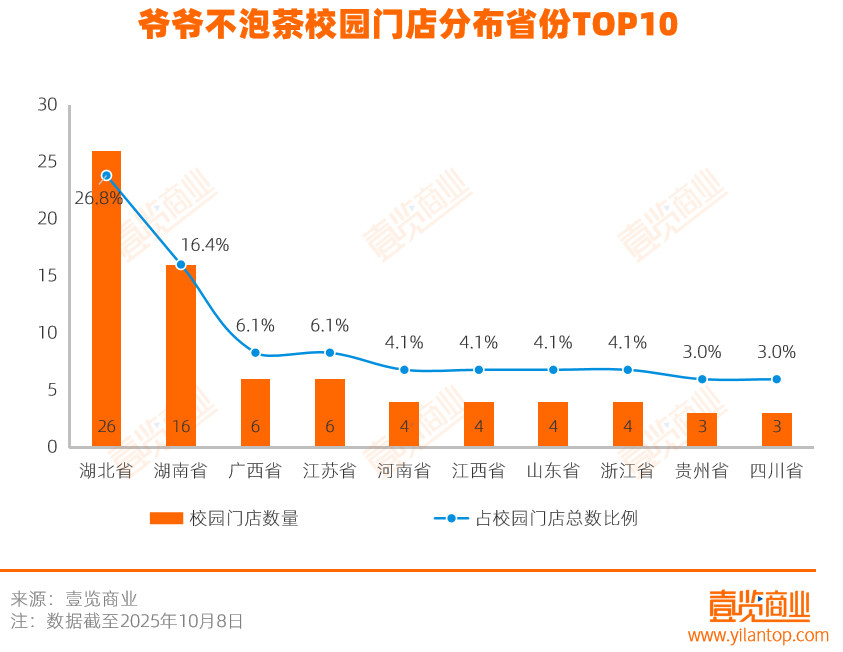 地域分布上,武汉作为品牌本土市场,高校渗透表现突出。全市83所高校中,爷爷不泡茶已进入16所,开设16家门店,覆盖率达19.28%,对本地资源进行了有效利用。长沙紧随其后,拥有8家校园店。相比之下,品牌在其他城市的布局则相对零散,平均每座城市仅有1至2家门店。