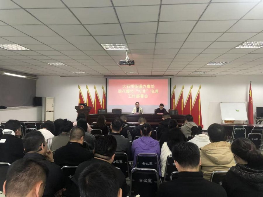为贯彻落实上级部门关于烟花爆竹“打非”工作要求,全面排查打击非法生产、经营、储存燃放烟花爆竹行为,杜绝烟花爆竹安全事故发生,保障社会公共安全和人民群众的人身财产安全,2025年10月15日,大石桥街道办事处召开烟花爆竹“打非”治理工作部署会,街道中层以上干部及各社区安全员参加本次会议。