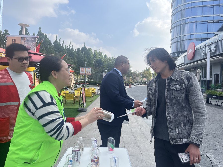 10月15日,在郑州市公安局禁毒支队、经开分局禁毒大队的指导下,潮河办事处联合同行禁毒社工,走进金地社区中建七局商业广场开展禁毒知识宣传活动。活动现场,往来顾客纷纷驻足,认真聆听工作人员的讲解,仔细观察毒品仿真模型,在互动交流中加深了对毒品危害的认识,提升了识毒、防毒、拒毒的意识和能力。