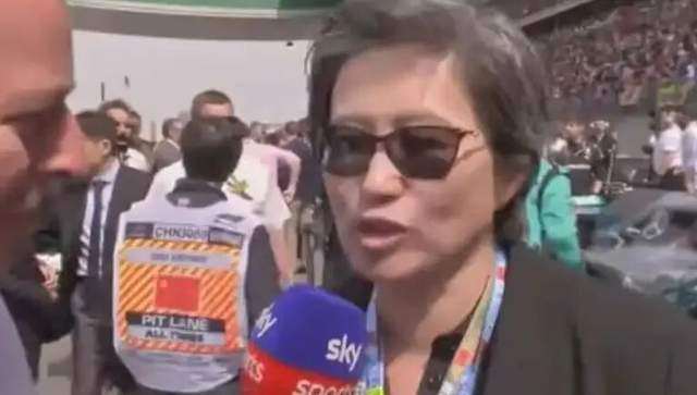 这个留短发戴墨镜、一身黑衣的女人就是苏姿丰,她用英文回答:“我来自AMD,我们赞助了法拉利车队。”