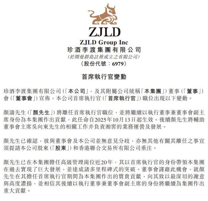 10月13日,珍酒李渡(6979.HK)公告宣布公司首席执行官职位出现变动。