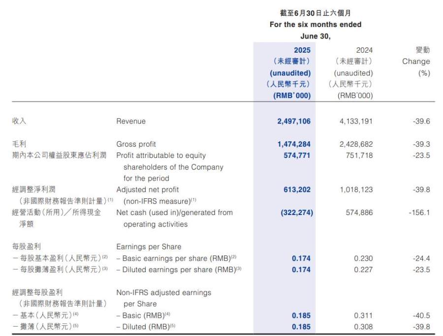 进入2025年,下滑态势进一步加剧。今年上半年营收24.97亿元,同比减少39.6%;股东应占溢利5.75亿元,同比减少23.5%;旗下四大白酒品牌均经历不同程度收入下降,其中珍酒作为核心单品收入减少44.8%至14.92亿元,成为业绩下滑的“重灾区”。