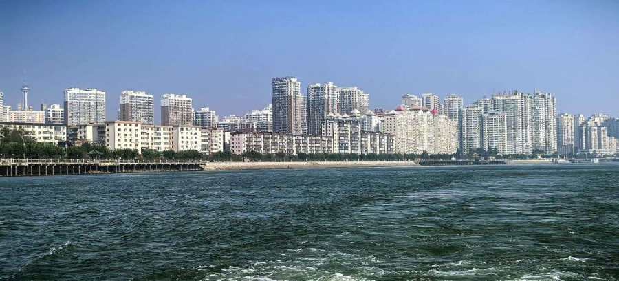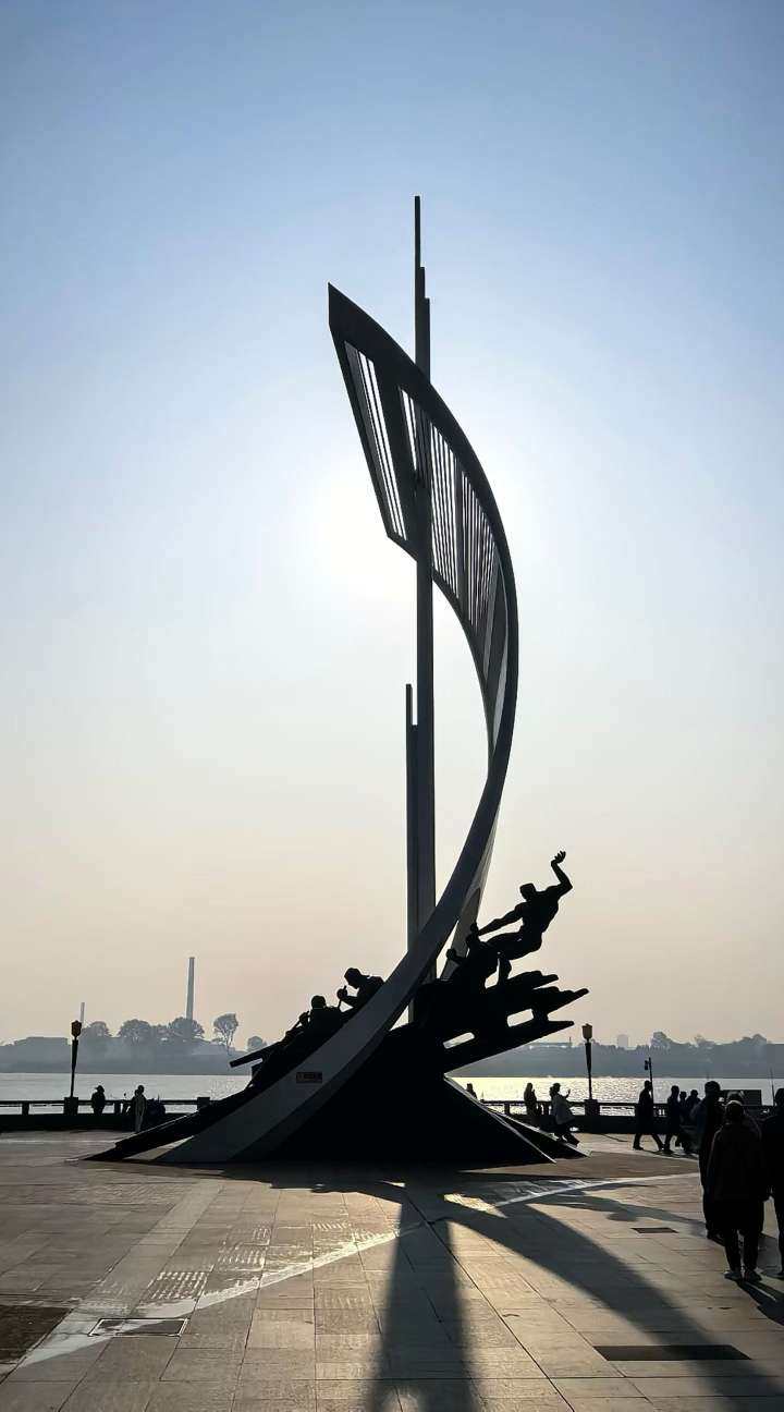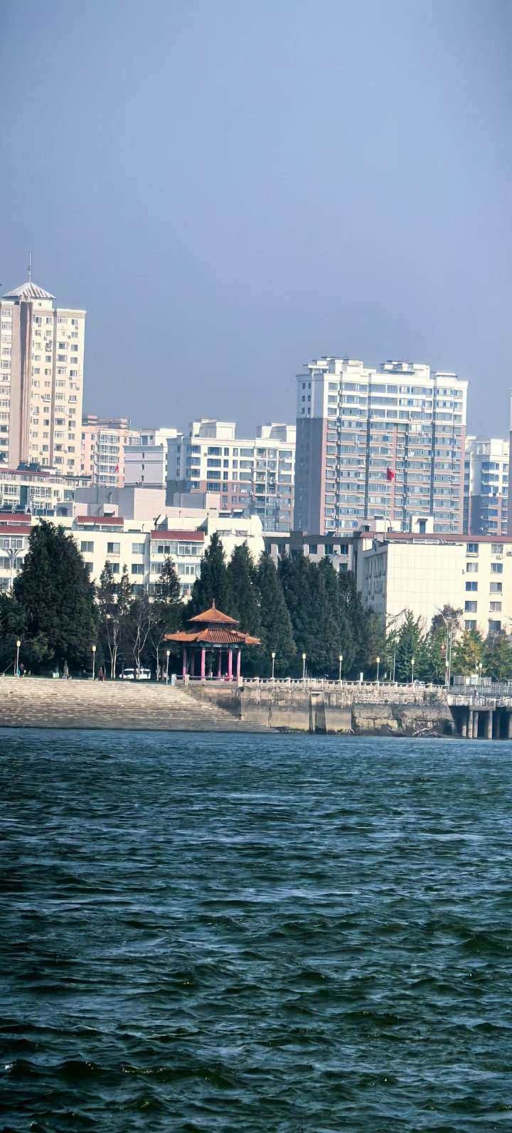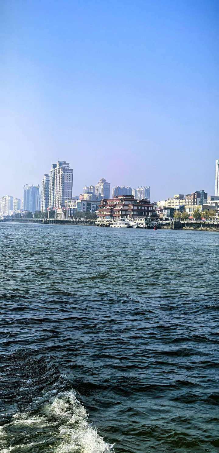 今胜昔,楼似阁;波映日,风梳郭。看长桥卧浪,往来舟舸。白鸽振翅开画境,新城焕彩承前诺。凭栏处、追念复低吟,情难却。