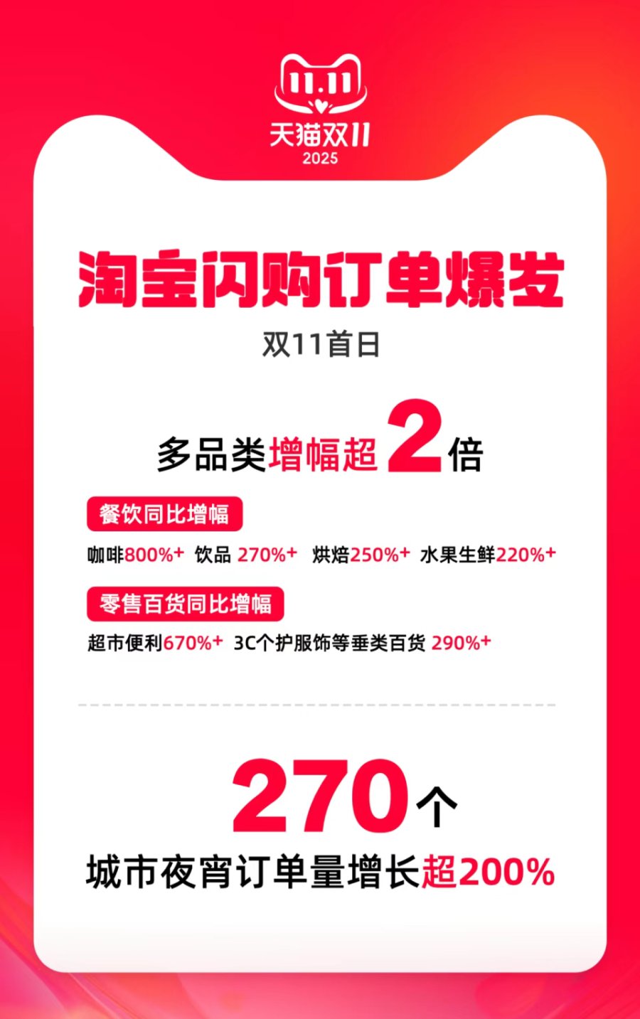 这是今年双十一“即时零售”成为标配的缩影:今年淘宝闪购首次参与天猫双十一,引入了折扣、千万免单红包等核心玩法。