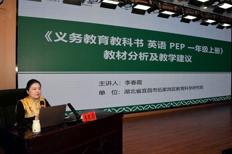 随后,人教版小学英语教材核心编写专家、宜昌市伍家岗区教科院教研员李春霞老师系统解读了一年级上册教材。她从六大维度出发,提出“听说领先、四板块联动”等教学建议,指导教师关注“主题螺旋上升、能力梯度递进”的编写逻辑,实施精准启蒙教学。李老师还结合二年级上册教材作专题报告,进一步帮助教师贯通理念与实践。