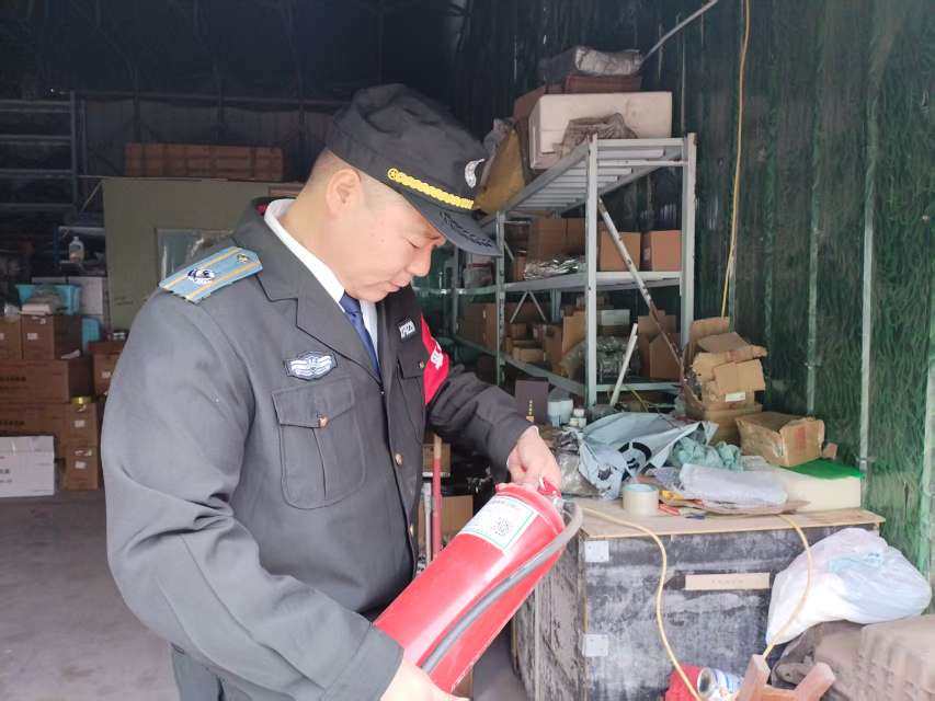 在汽配城仓库内,巡防队员重点对消防设施配备、使用情况进行细致检查,认真查看灭火器是否在有效期内、压力是否正常,同时对仓库内货物堆放是否规范、电气线路是否存在私拉乱接等隐患点逐一排查。