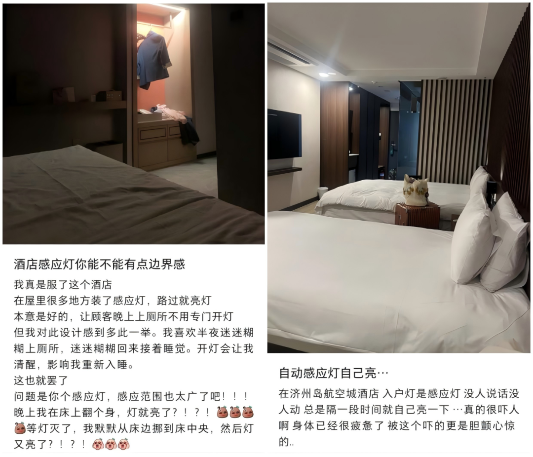 其中,感应灯是吐槽重灾区,不是不够灵,就是过于灵敏。本来是为了提升客人体验,结果硬生生变成了睡眠负担,酒店当真是好心办坏事。