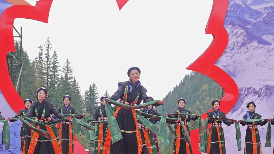 《开坛迎宾》在古老神圣的“开坛仪式”中拉开序幕,《“千姆”迎祥》《阿拉虔同》等原生态舞蹈“鲜活”亮相,一曲《冰川之恋》更与漫山彩林意境交融,抒发秋日浪漫。