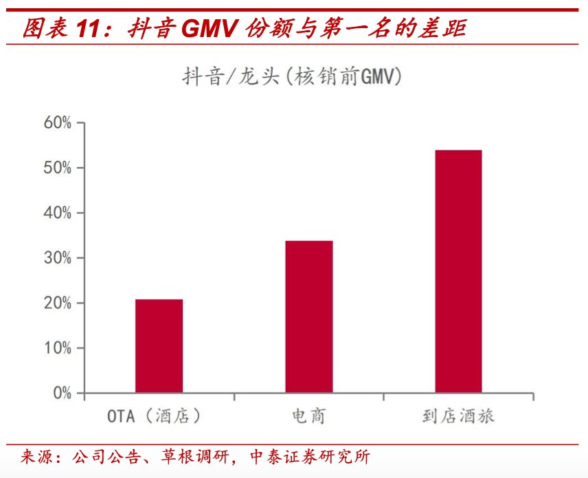 据中泰证券估算,抖音在 OTA 行业的市场份额上升较为缓慢,预计核销前 GMV 仅为携程 20%左右,远低于在电商、到店领域的份额。进一步考虑显著偏低的抖音酒店核销率,实际份额差距更大。