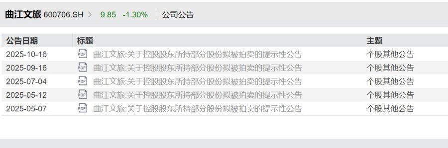 蓝鲸记者梳理发现,今年以来,曲江文旅五次发布股份拟被拍卖的提示性公告,从结果看,流拍、和解、成交等均有发生。