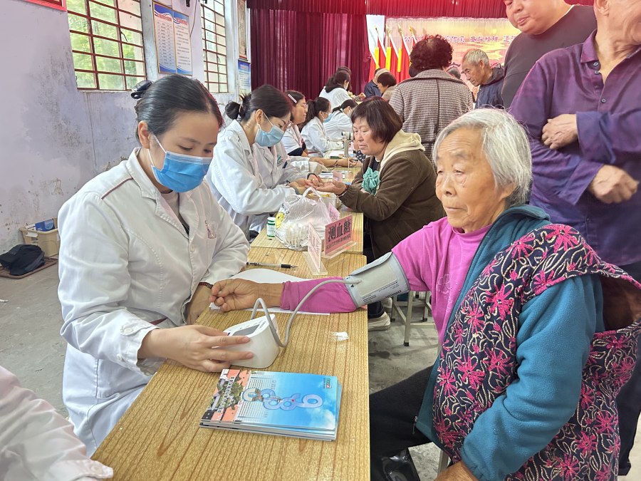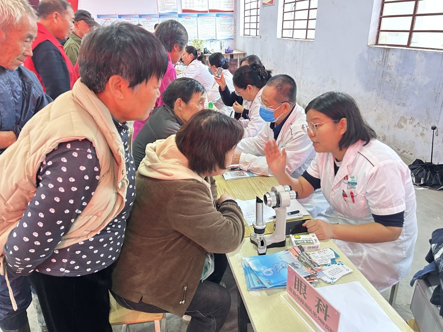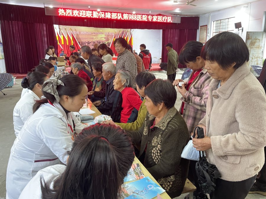 清晨的村委大院,在淅淅沥沥的小雨中,村民们撑着雨伞,早早便在诊台前排起了长队,义诊室内,内科、心血管科、眼科等诊台前人头攒动,免费的血压、血糖测量服务也备受青睐,面对热情的乡亲,第988医院的专家们展现出极高的职业素养,耐心细致地为每一位村民听诊、查体、解答疑问,为群众发放健康科普资料及常用药品。