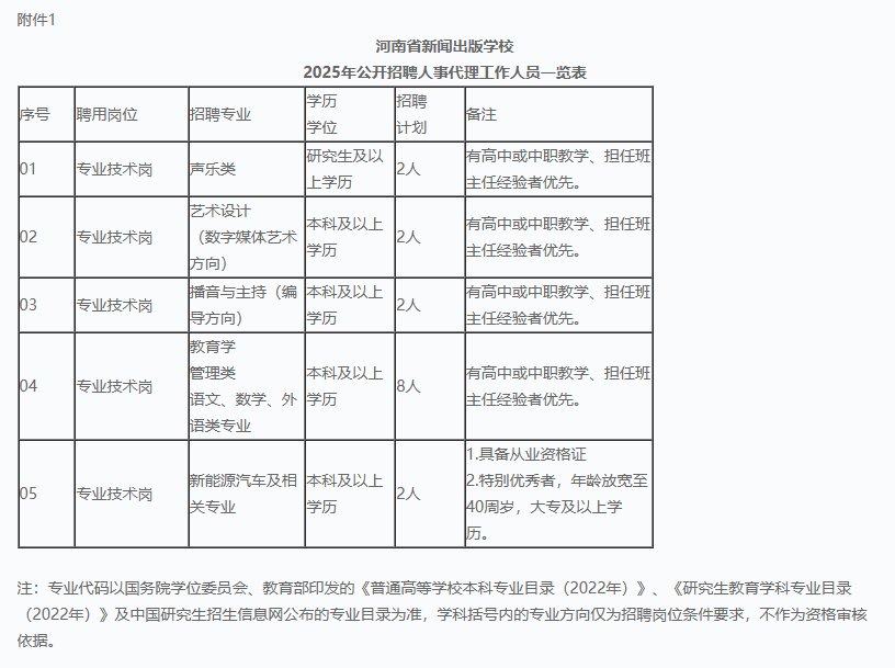 7.岗位所需的专业和其他条件(详见附件1《河南省新闻出版学校2025年公开招聘人事代理工作人员一览表》)。