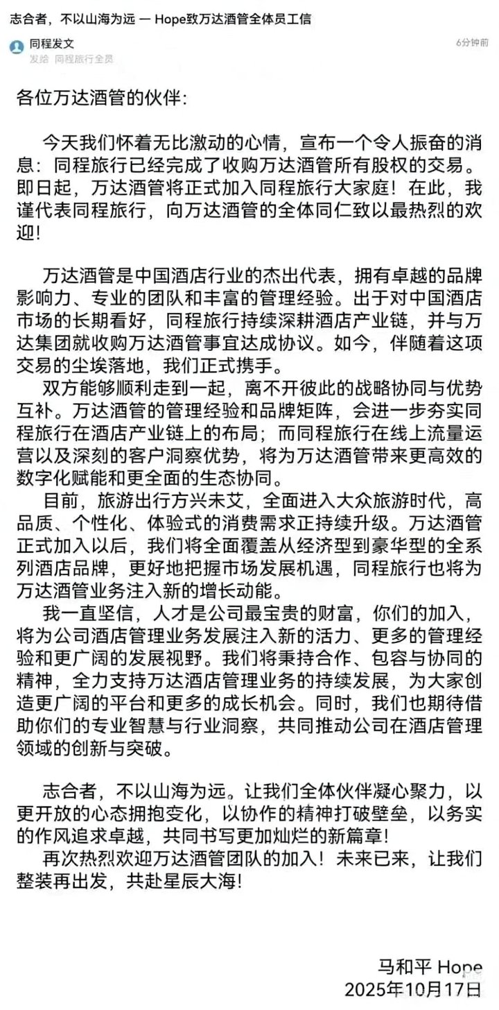 近日,同程旅行正式宣布完成对万达酒店管理(香港)有限公司100%股权的收购,交易对价24.9亿元。此次收购标志着同程旅行补齐高端酒店业务“拼图”,实现从经济型到豪华型酒店的全品类覆盖。
